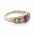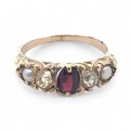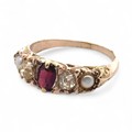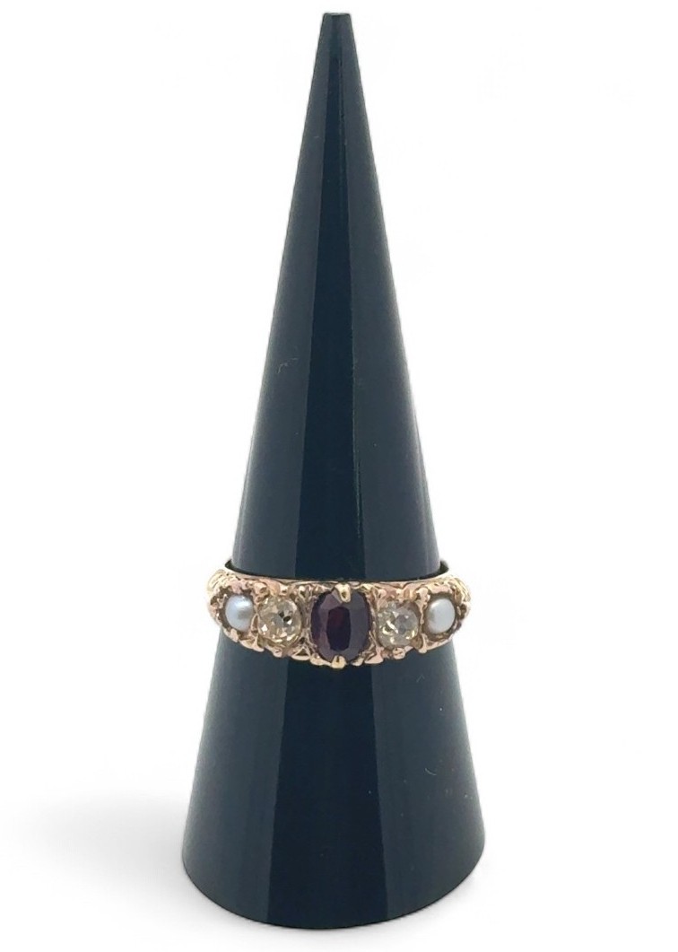 A garnet, old cut yellow diamond and pearl five stone ring, ...