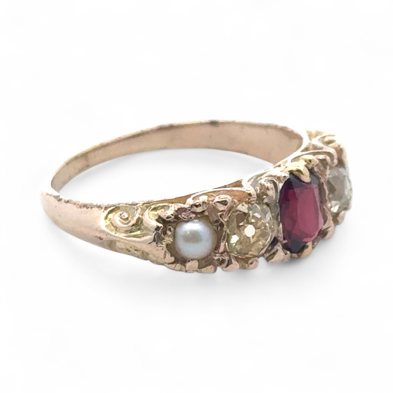 A garnet, old cut yellow diamond and pearl five stone ring, size O. In unmarked yellow metal tested as approx 7 to 8ct, with scroll gallery. 2.93g