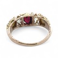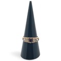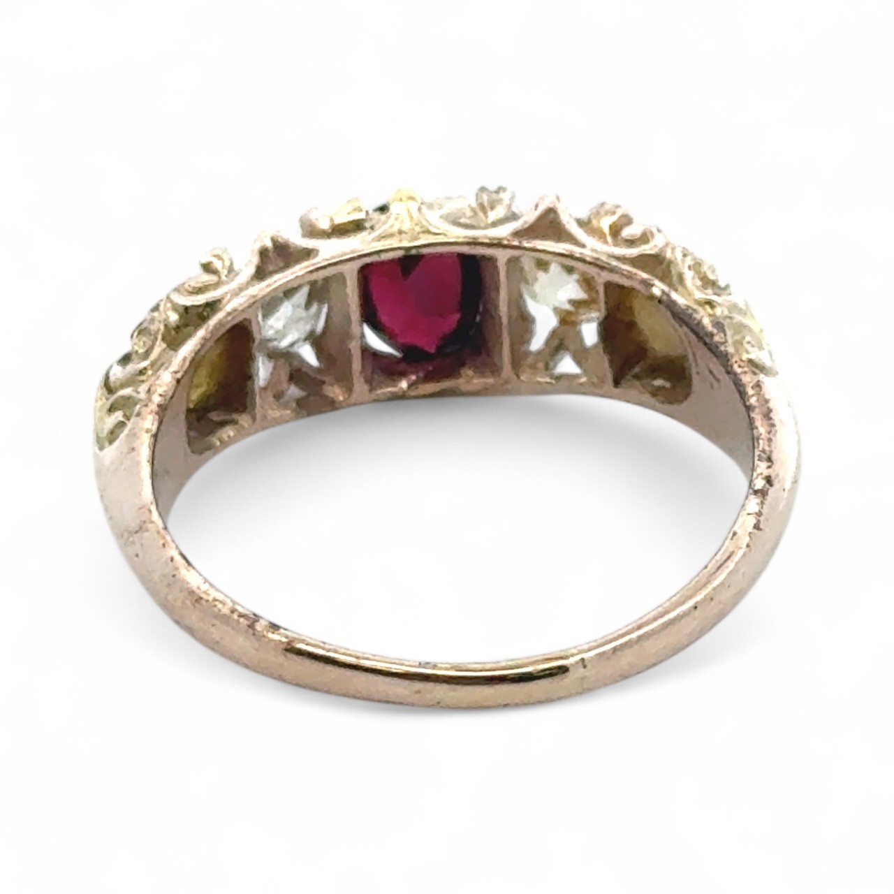 The ring is is good to fair condition overall. The garnet had a chip to the table and wear to the facet edges. Likely a replacement stone as it is small for the setting. There appears to be a couple of prongs missing so this may need attention. The paler of the diamonds has a graze to the side of the table facet. Diamond clarity grades approx SI2 and P2. Shank is thinning to the back.