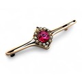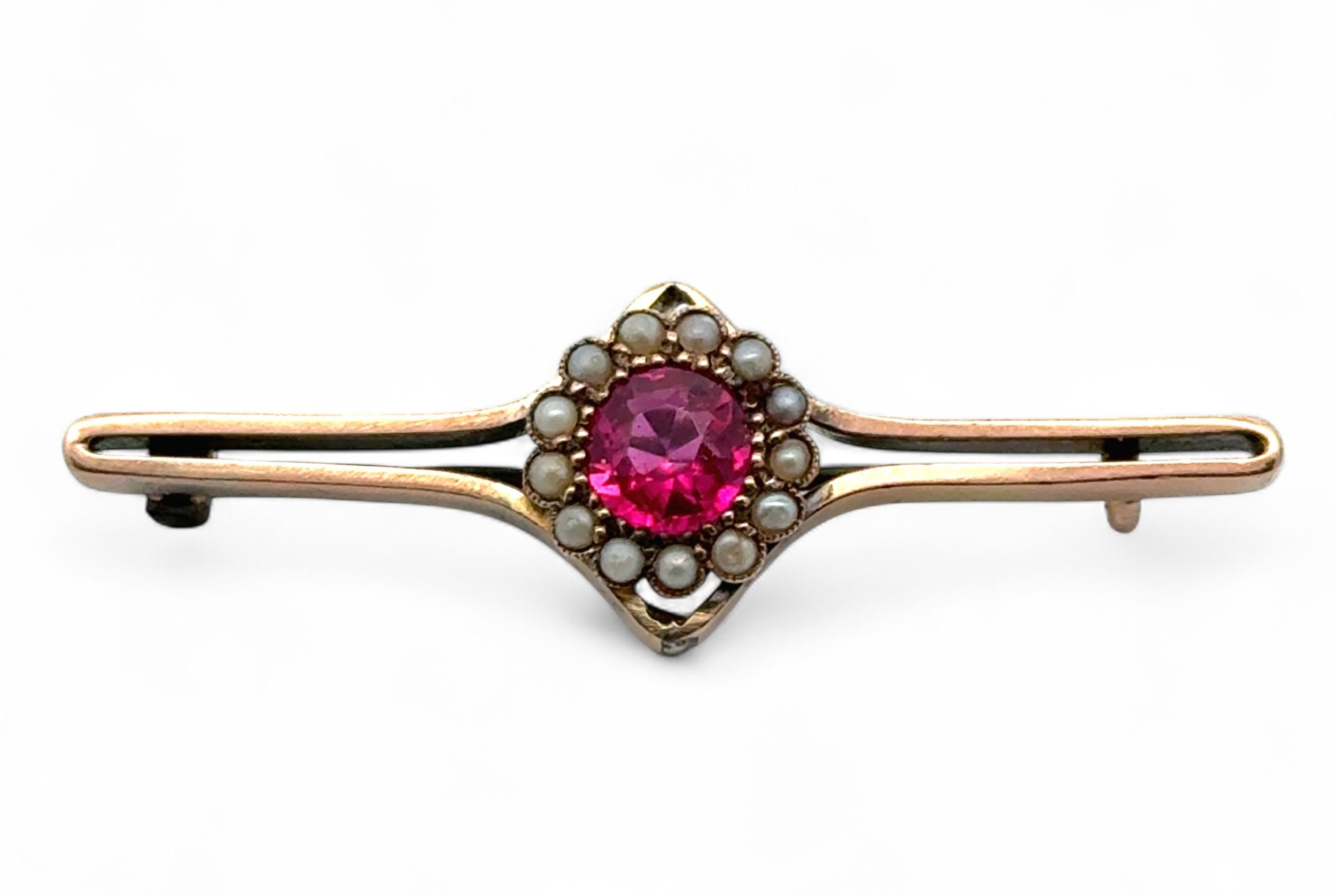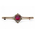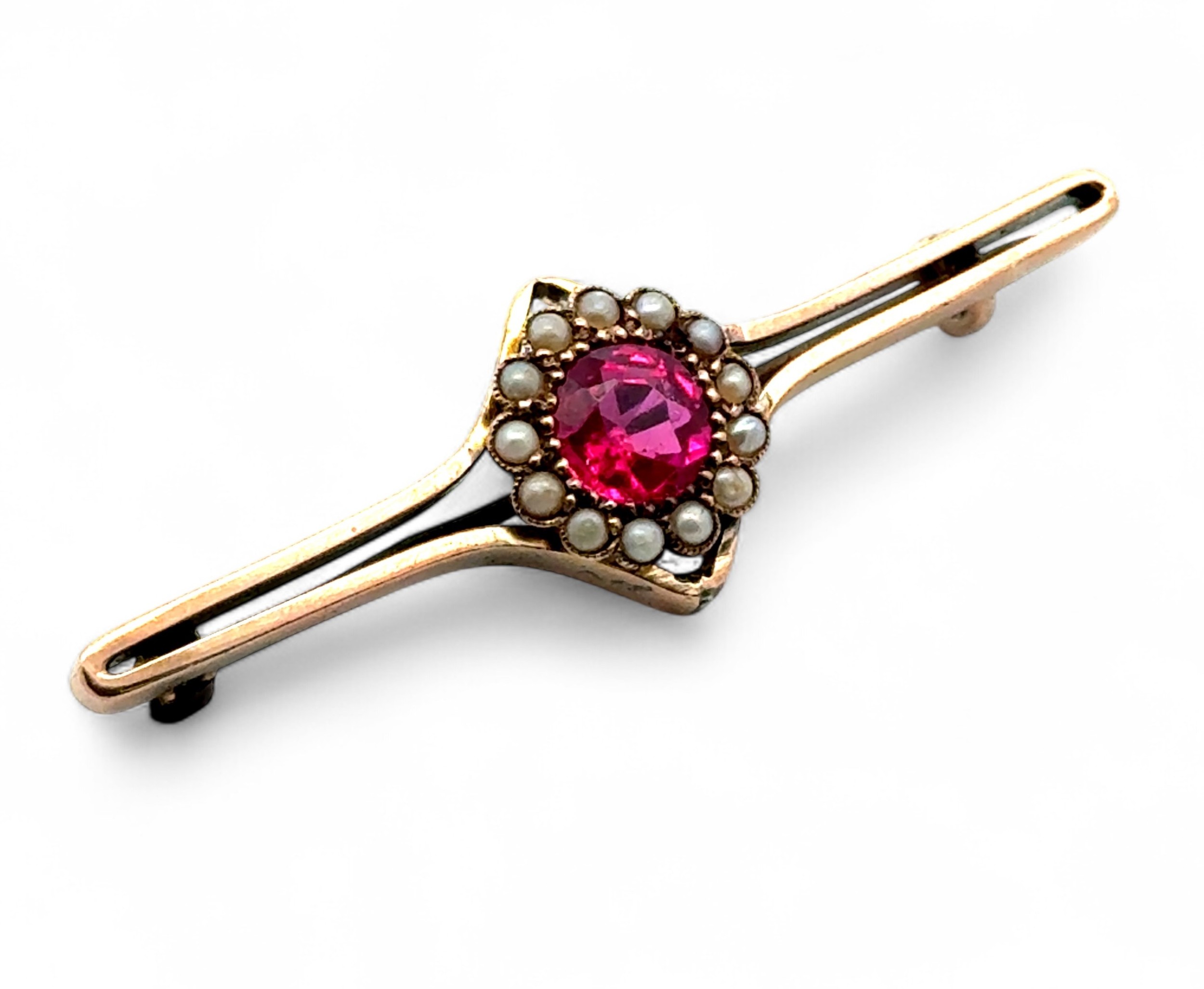 A ruby and pearl cluster bar brooch, approx length 5cm. Base...