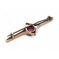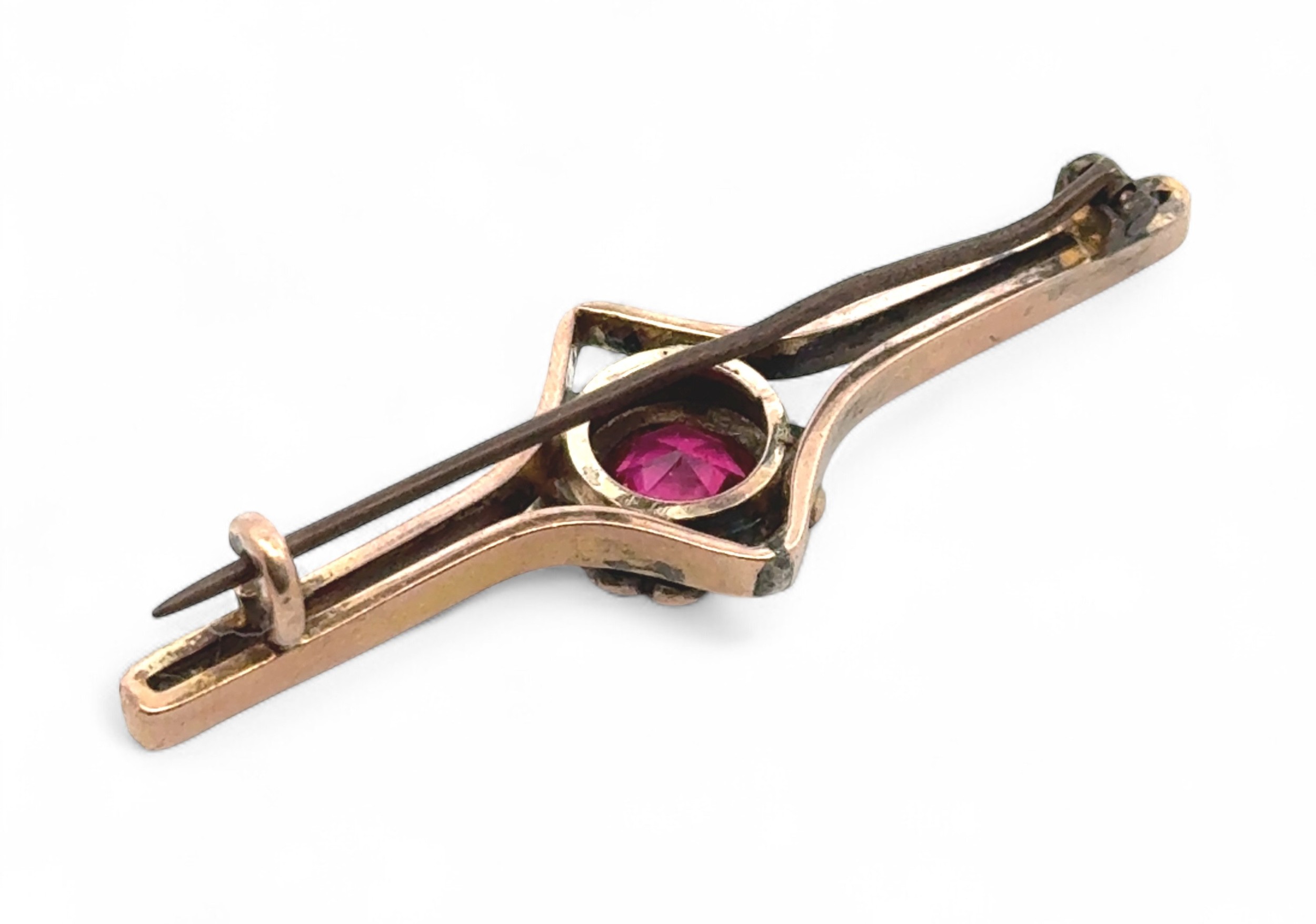 A ruby and pearl cluster bar brooch, approx length 5cm. Base metal pin. Tested as 9ct gold using XRF