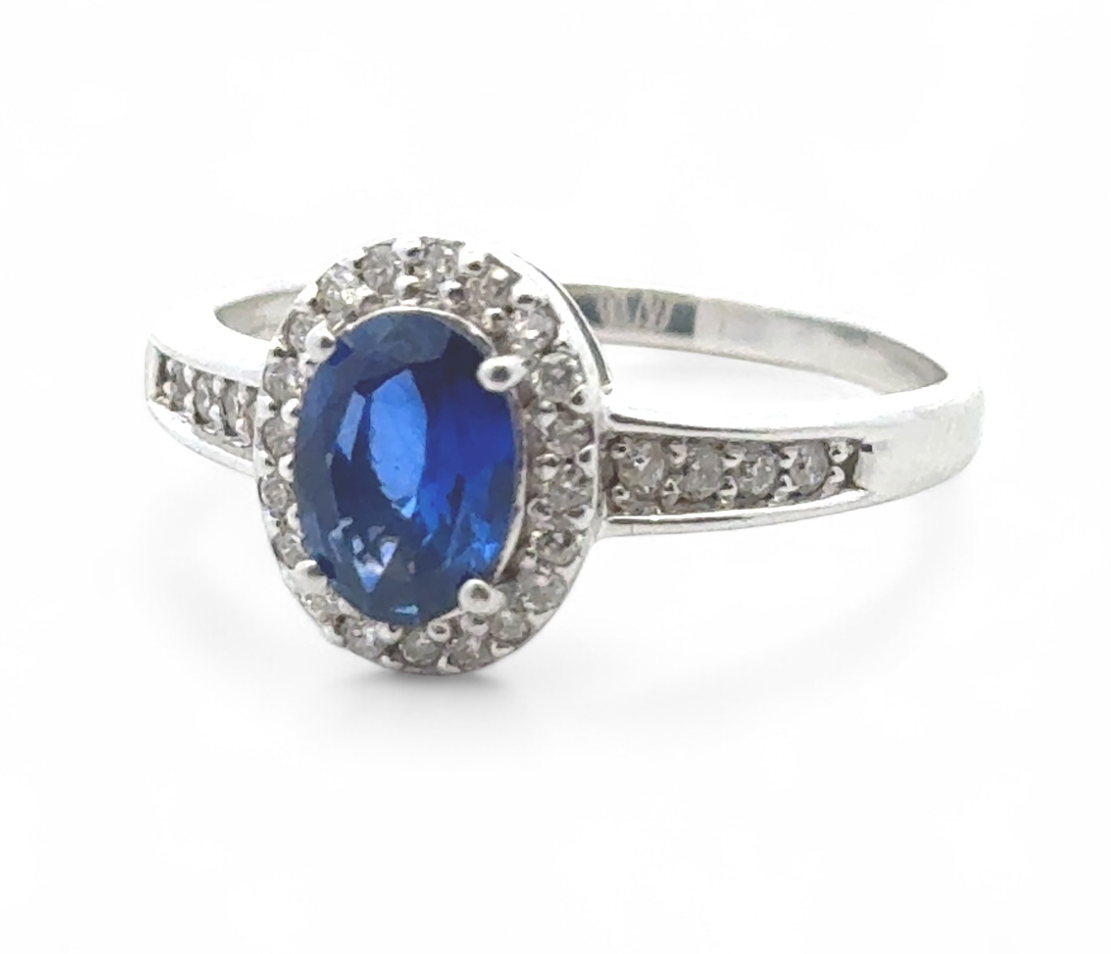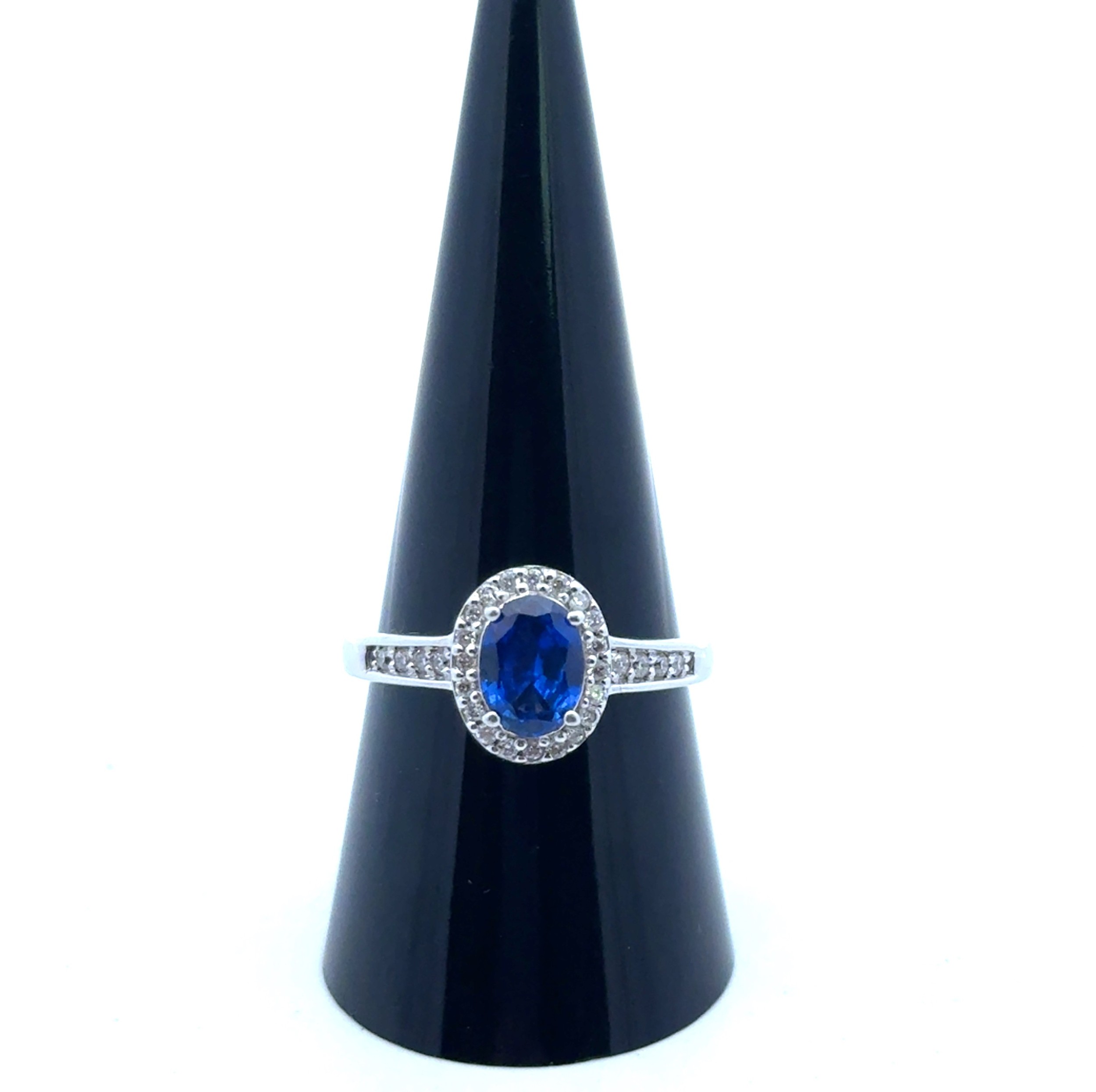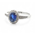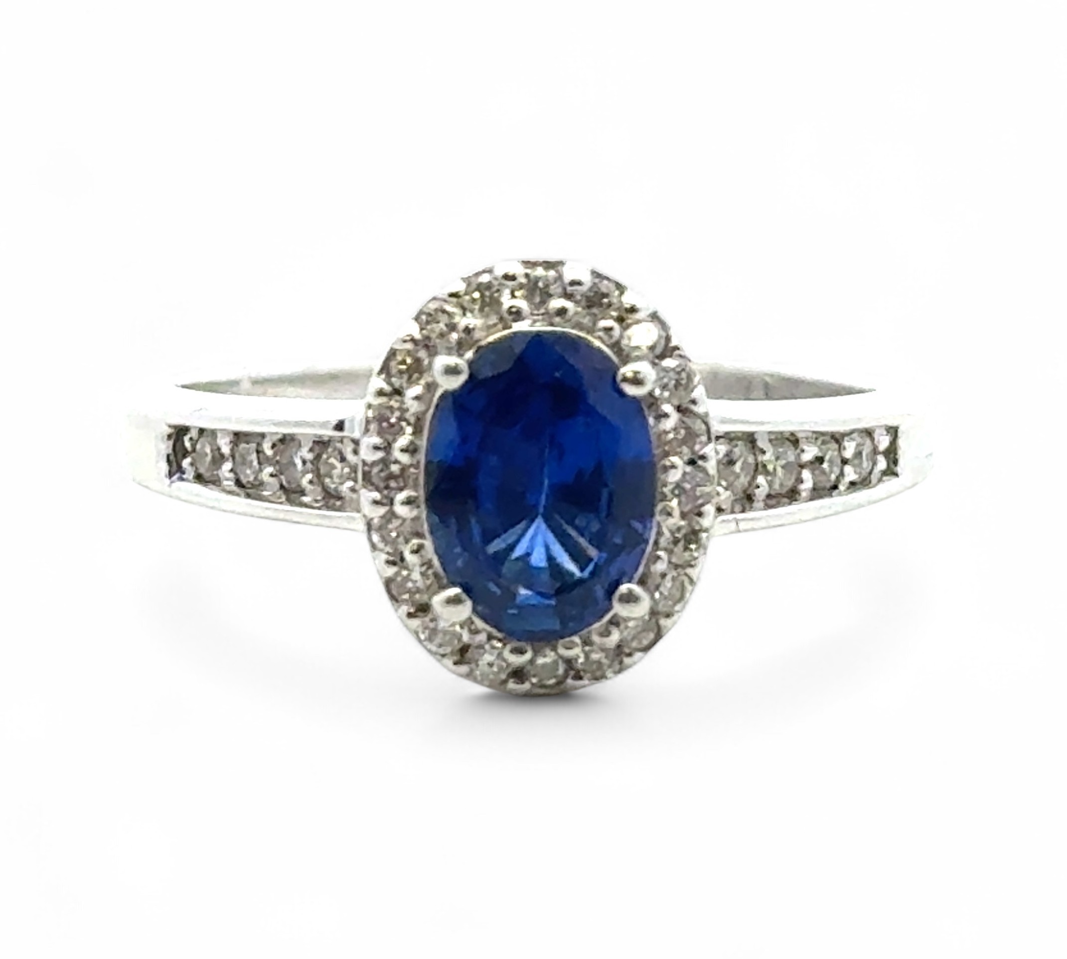 An 18ct white gold and sapphire stone and diamond cluster ring with diamond shoulders, QVC hallmarks. Size R. 4.61g