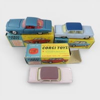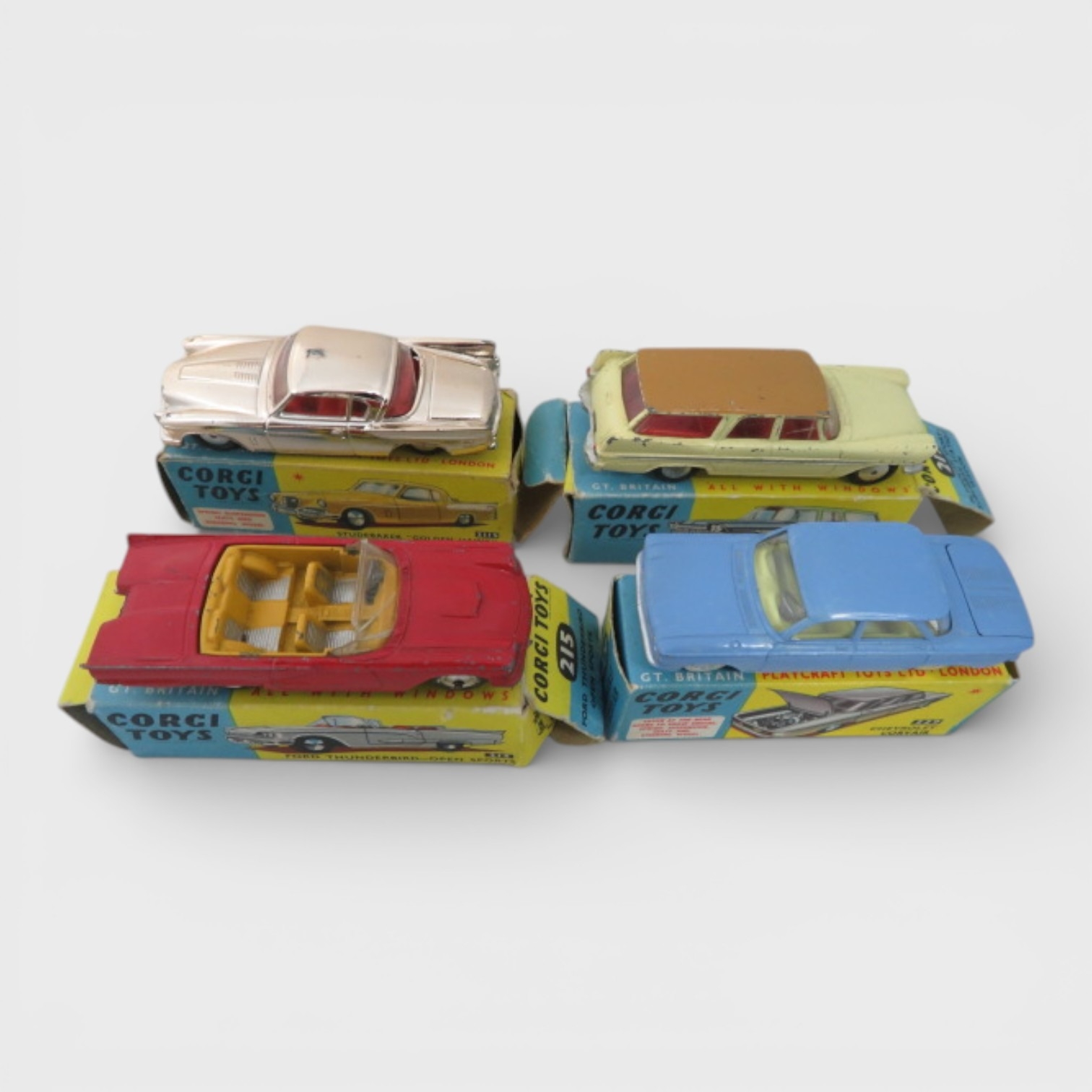 Corgi American collection, with Studebaker Golden Hawk (plated finish) No. 211S, Ford Thunderbird Open Sports No. 215, Plymouth Sports Suburban No. 219 and Chevrolet Corvair No. 229, generally good in good to fair boxes. Contents unchecked for completeness or correctness and viewing recommended. Qty 4