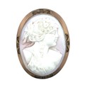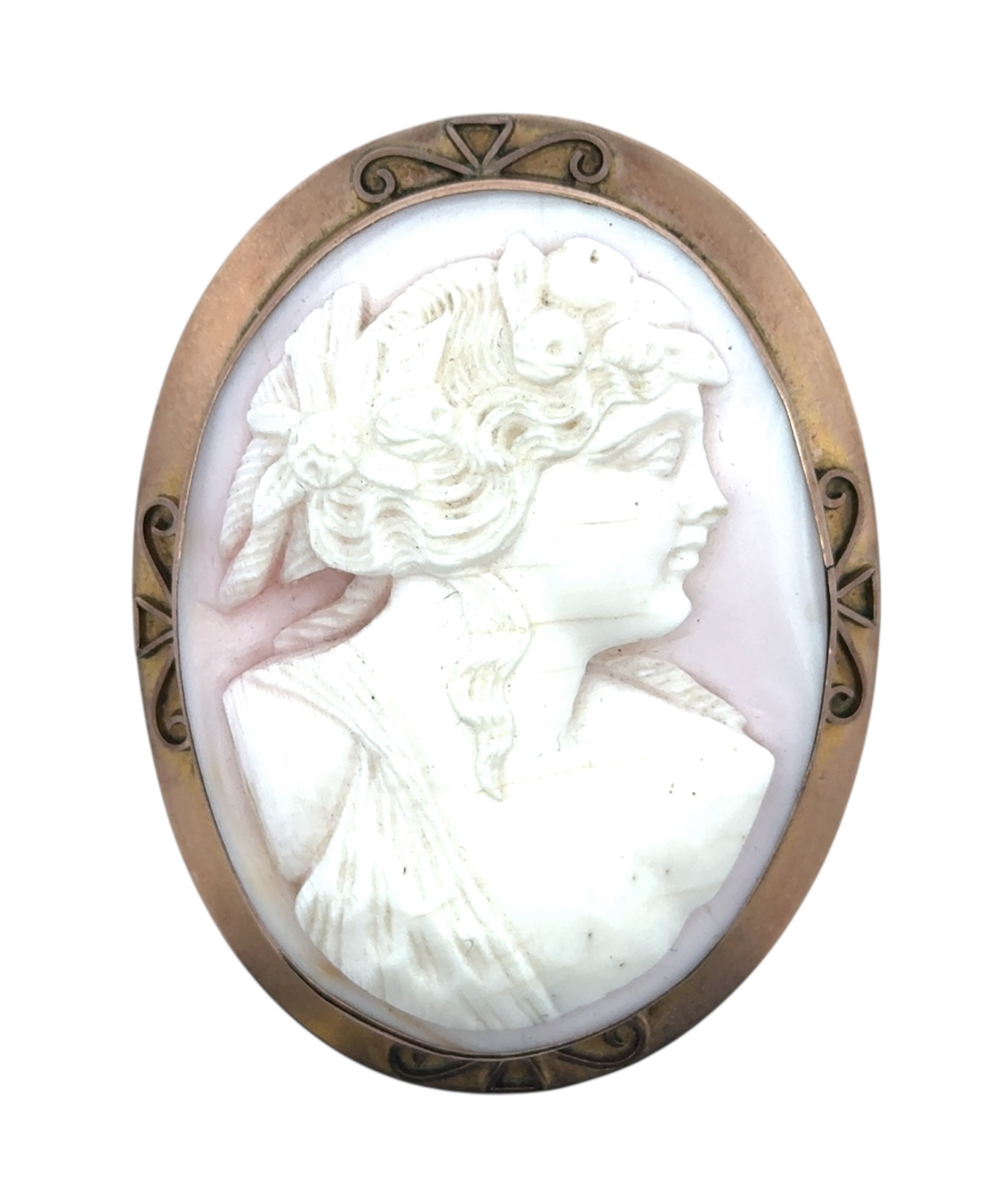 A pink and white shell cameo brooch depicting a Greek or Rom...