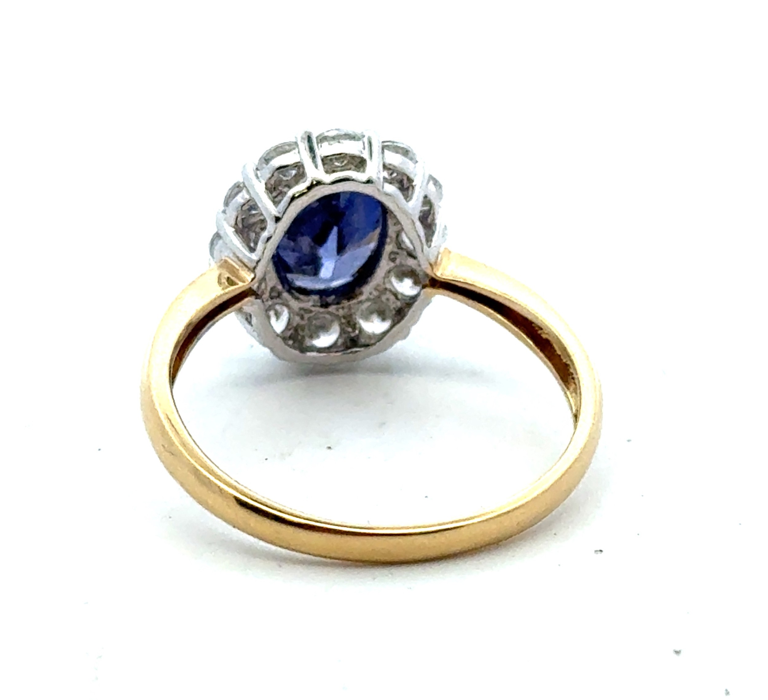 A 14ct yellow gold and oval blue and white CZ cluster ring, QVC hallmarks. Size Q. 3.31g