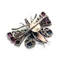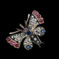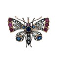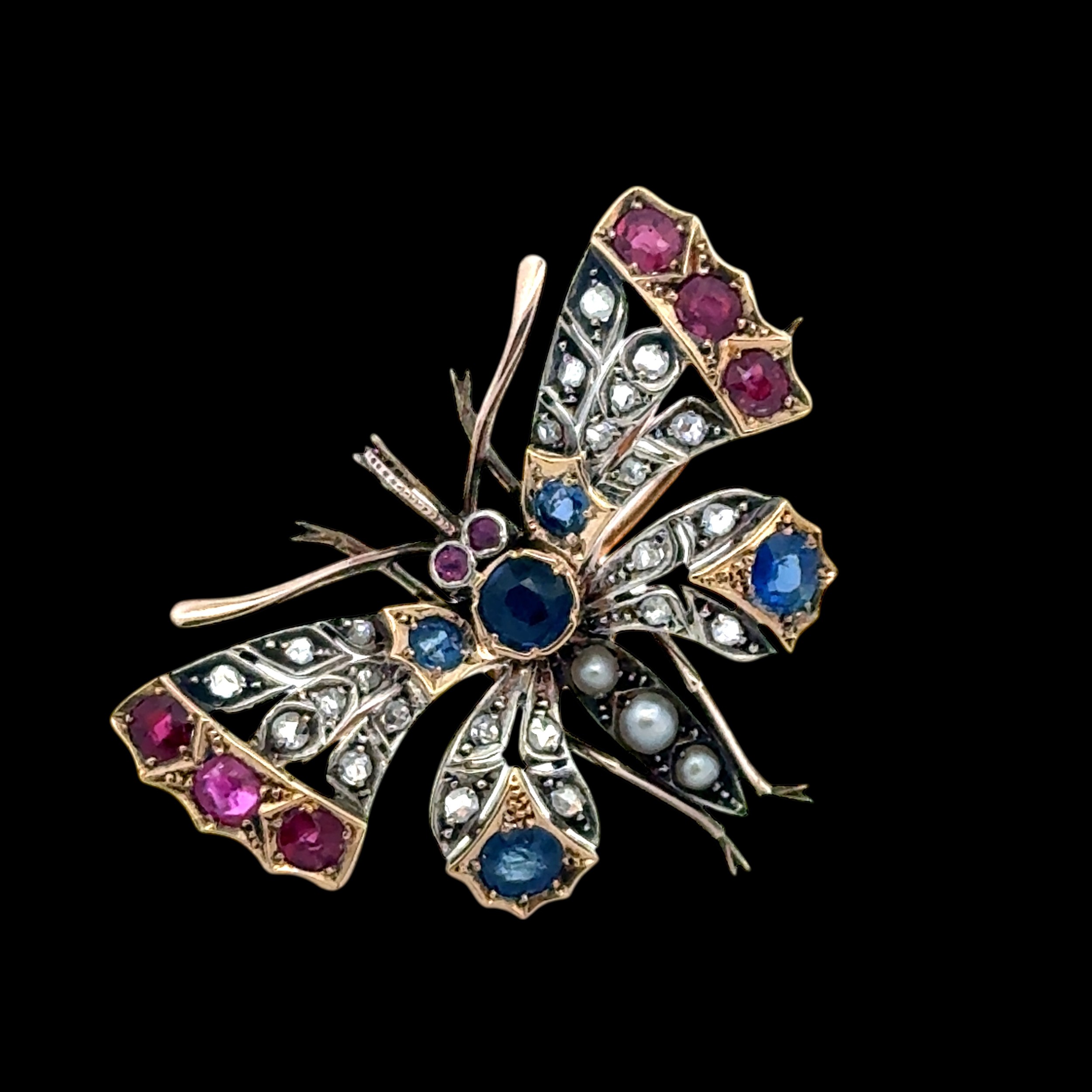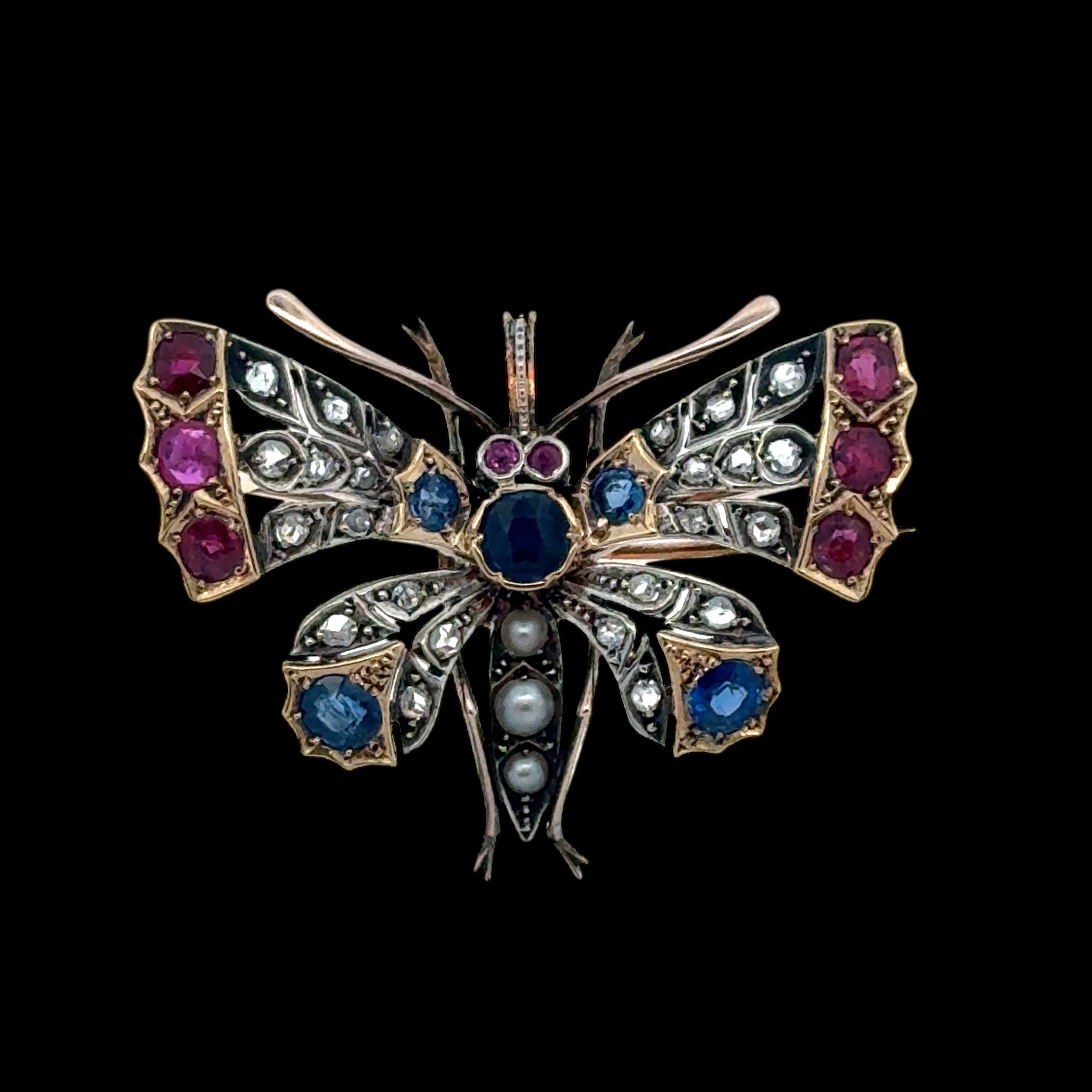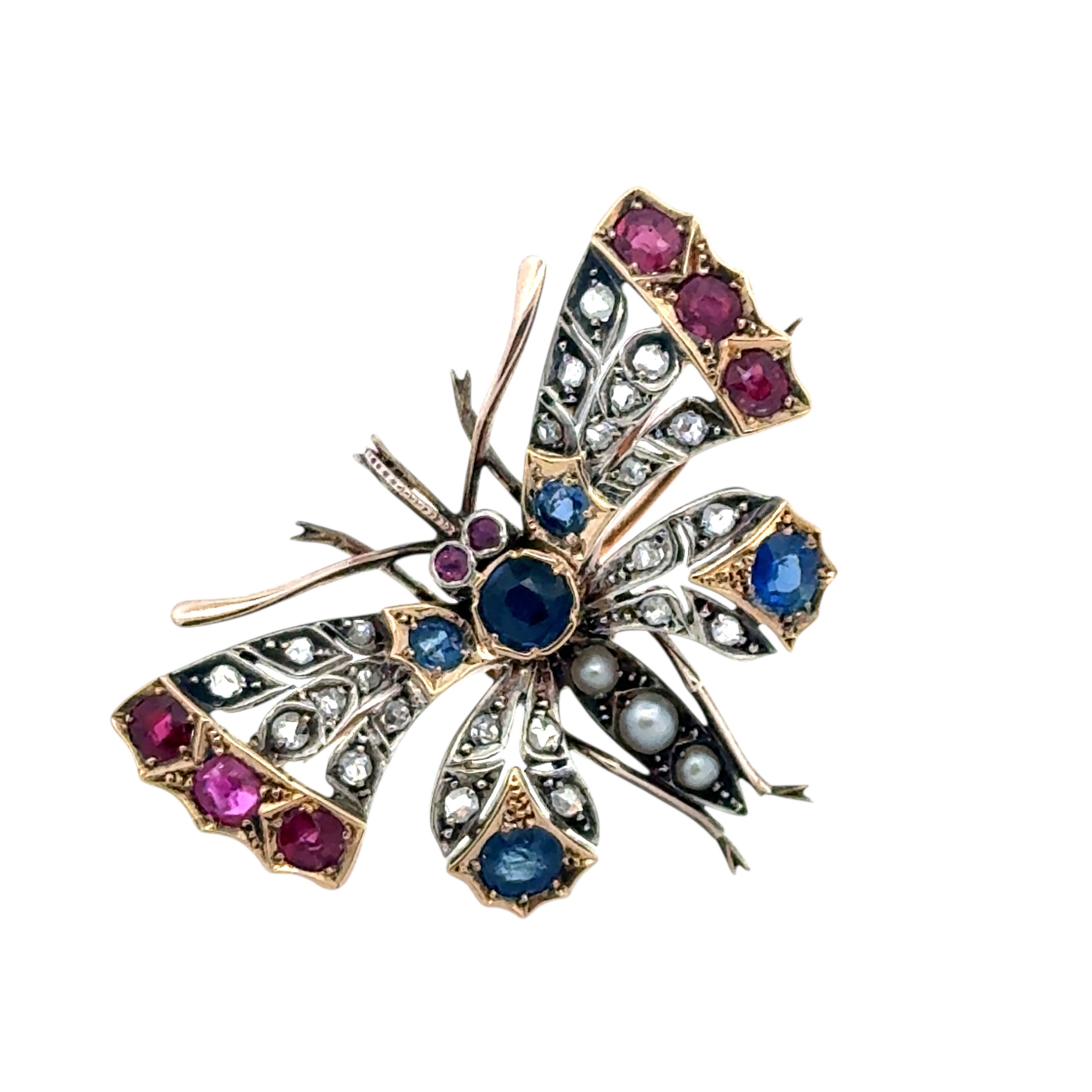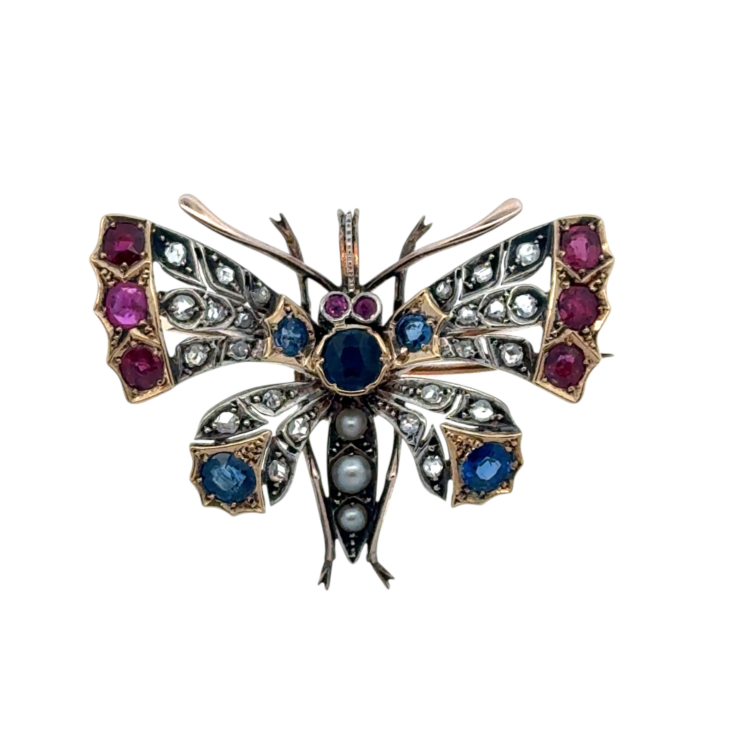 A Victorian butterfly brooch / pendant in gold and silver, adorned with rose cut diamonds, rubies, sapphires and pearls. With gold detachable brooch fitting. 44mm x 36mm. 14.63g