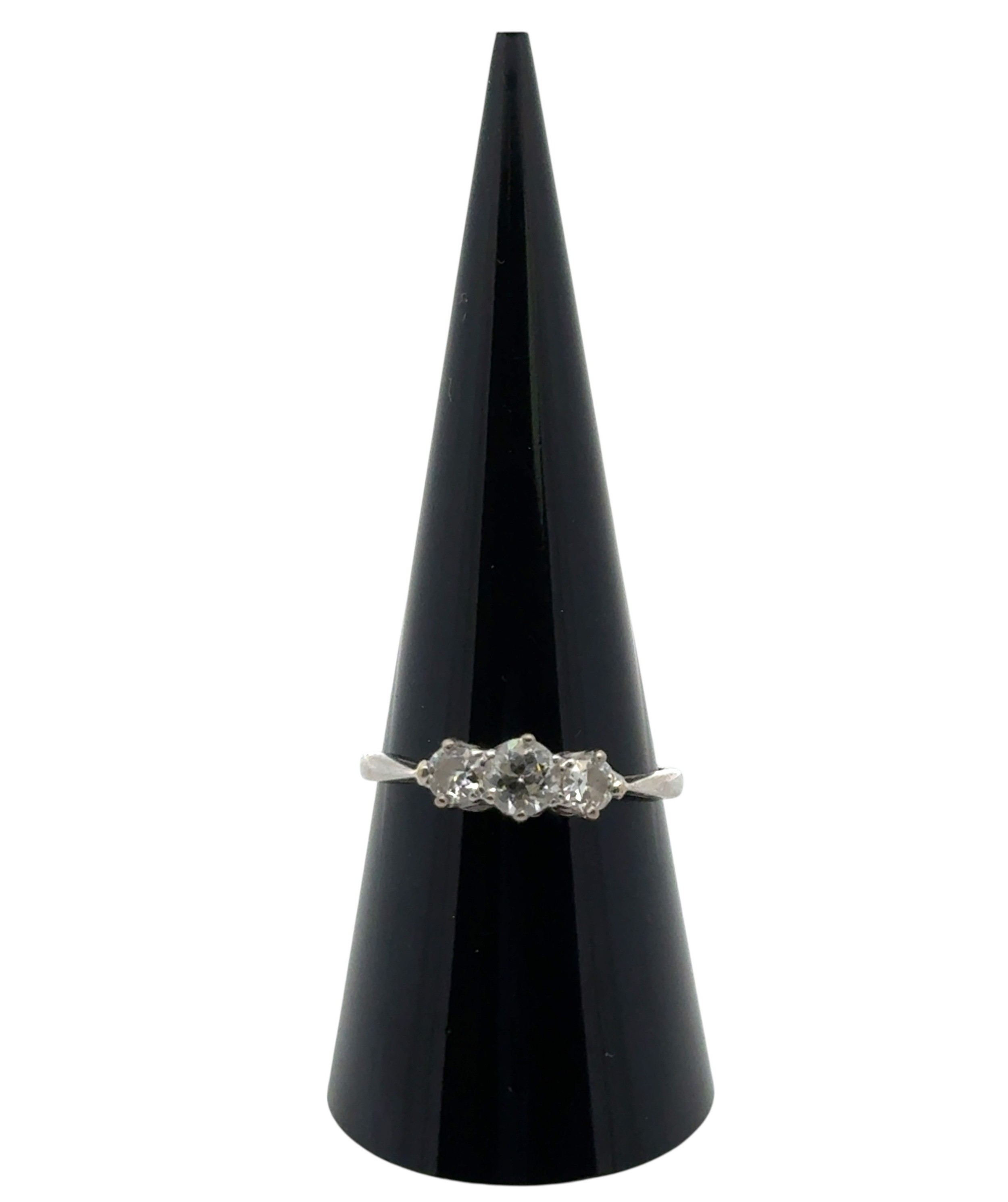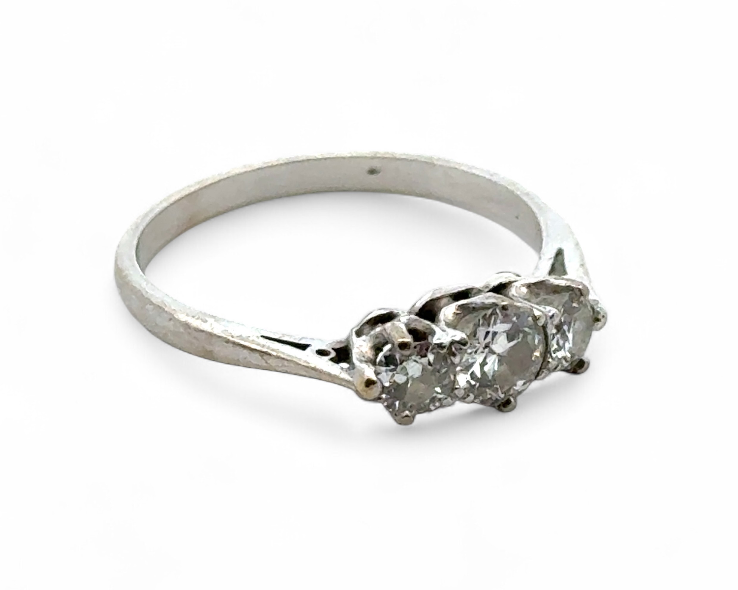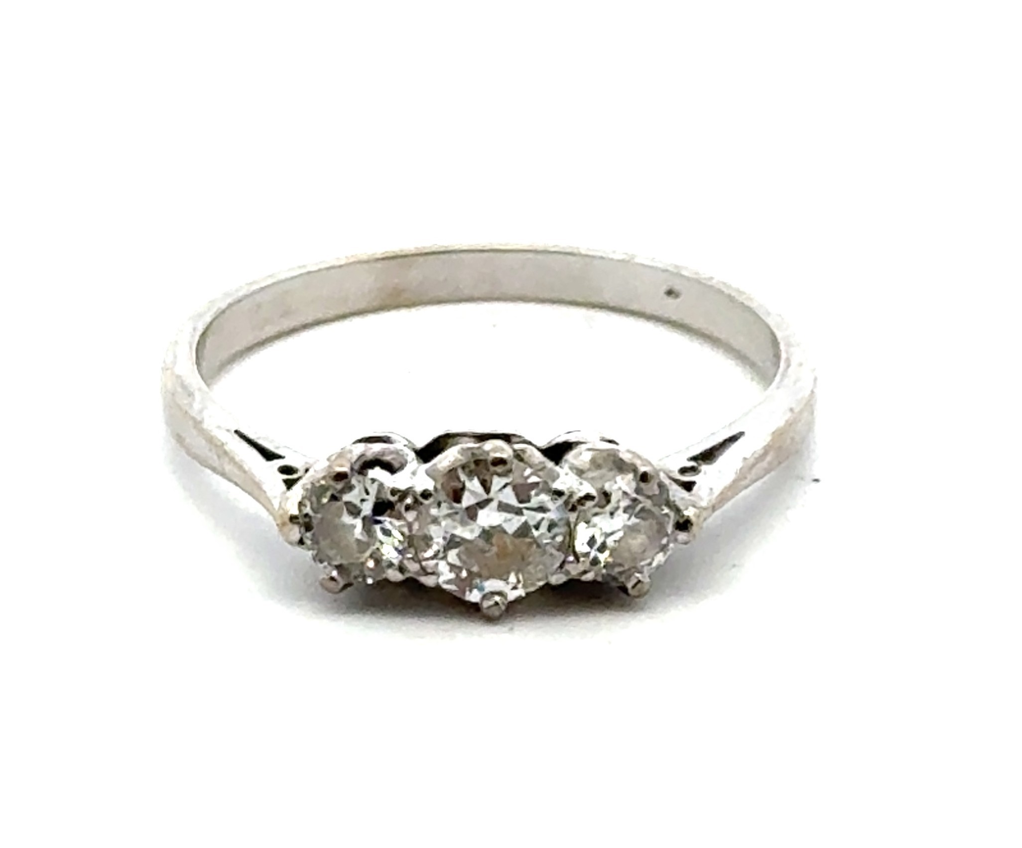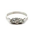 A three stone diamond ring in unmarked white metal, tested as 18ct gold. Estimated diamond weight approx 0.40ct. 2.93g Central diamond with chip to girdle.