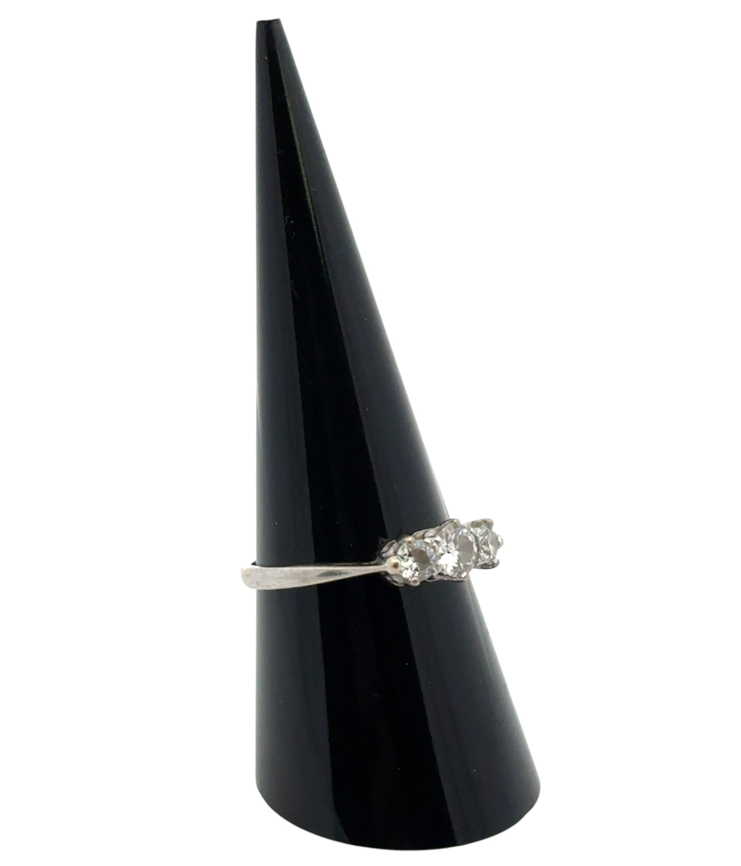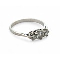 A three stone diamond ring in unmarked white metal, tested a...