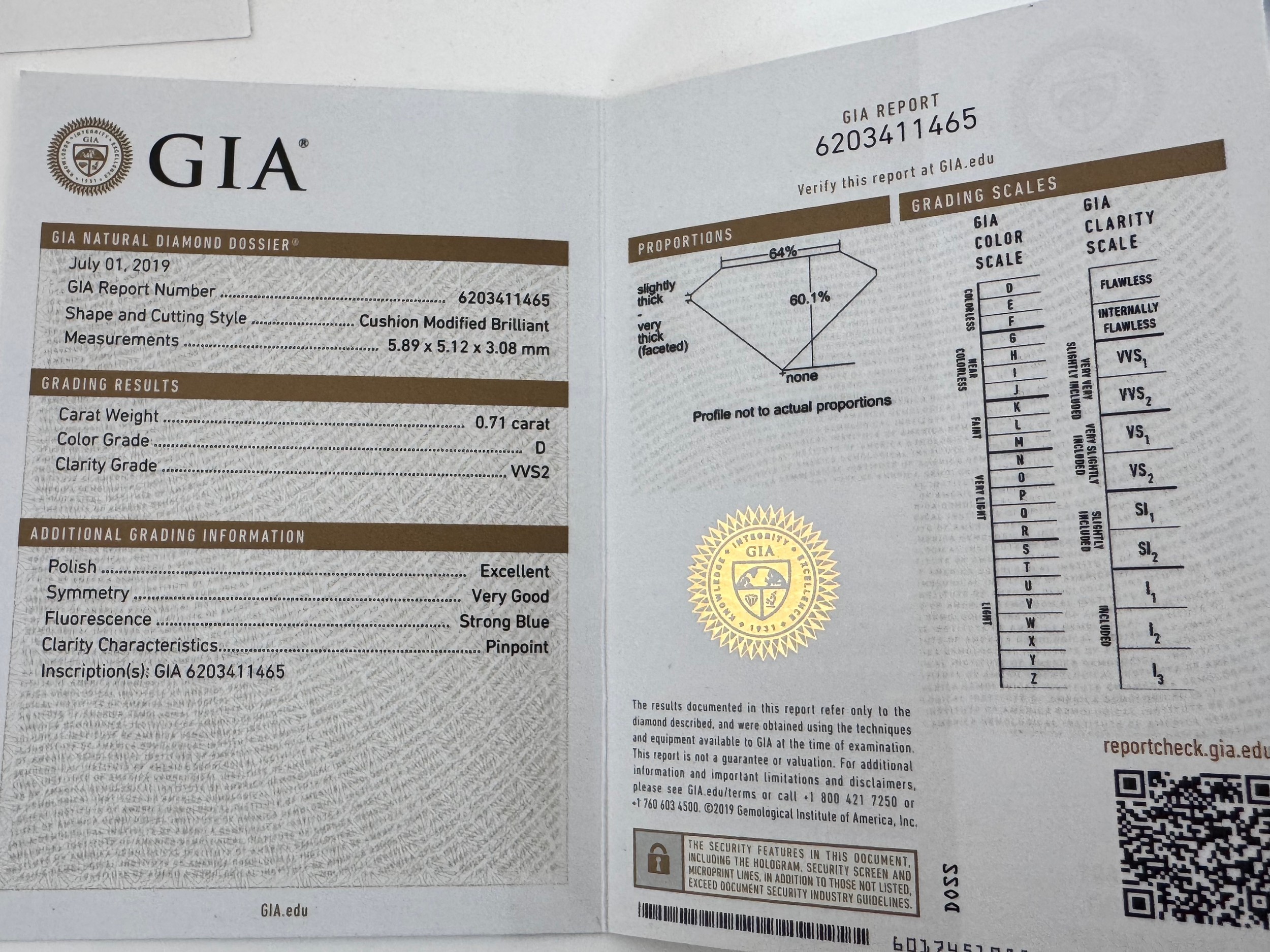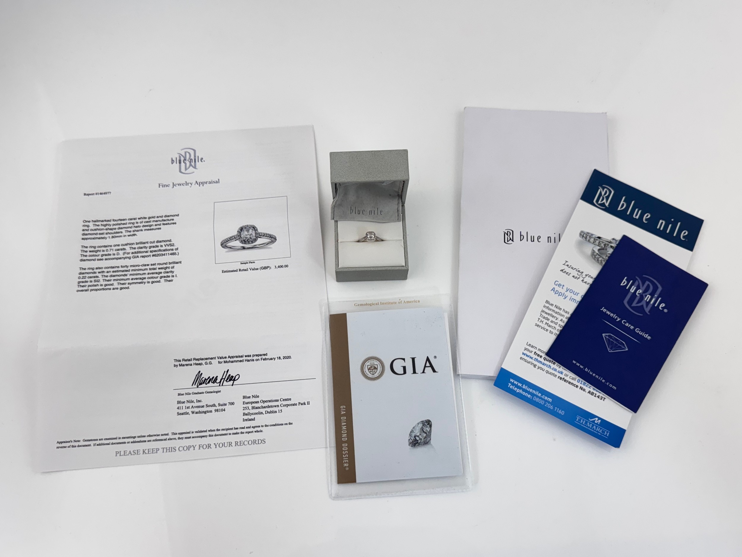 A 0.71ct cushion cut diamond halo ring with diamond set shoulders, size I. Total diamond weight 0.93ct. With GIA report stating principal diamond is natural, colour D, clarity VVS2, 0.71ct measurement 5.89mm x 5.12mm x 3.08mm. With Blue Nile box and appraisal certificate.