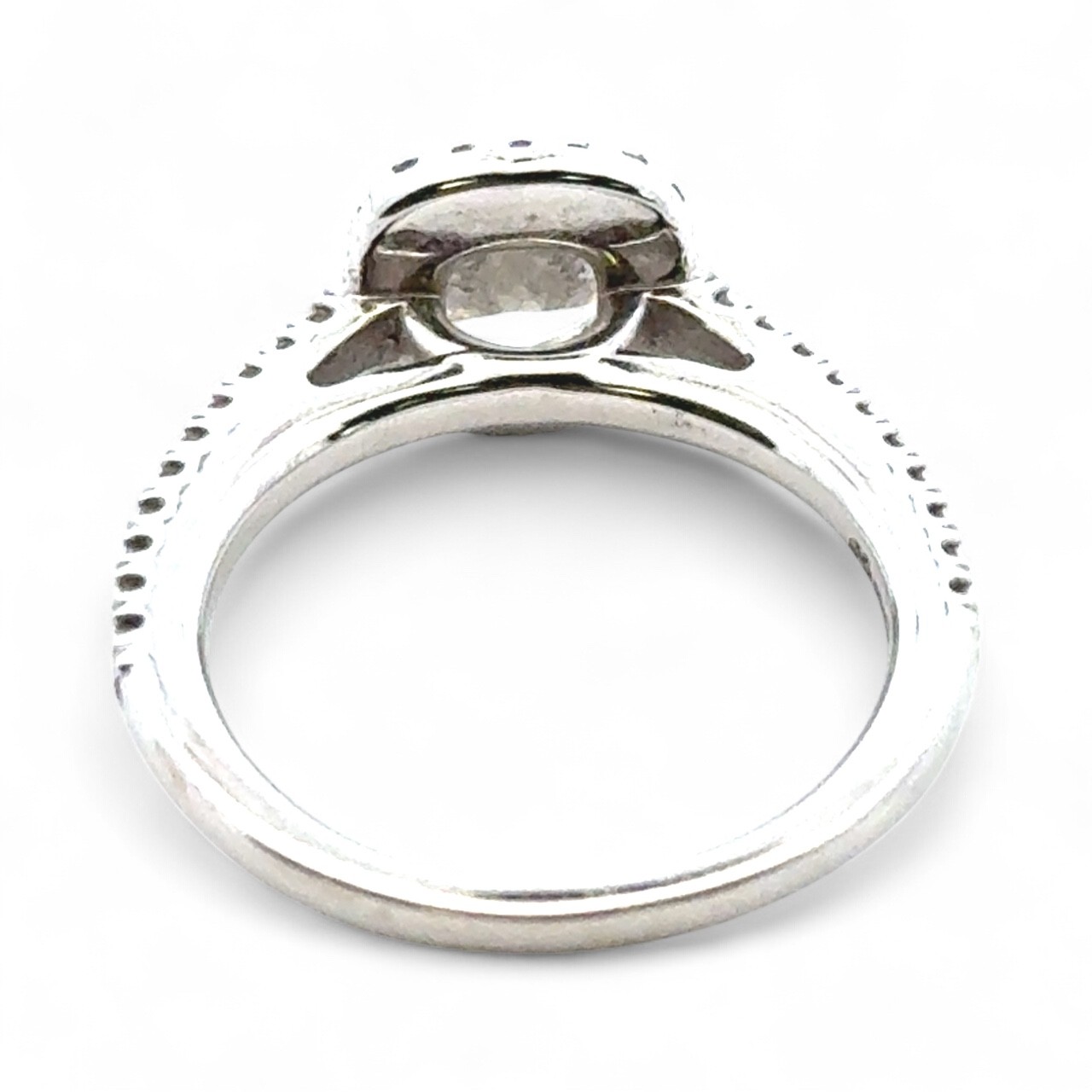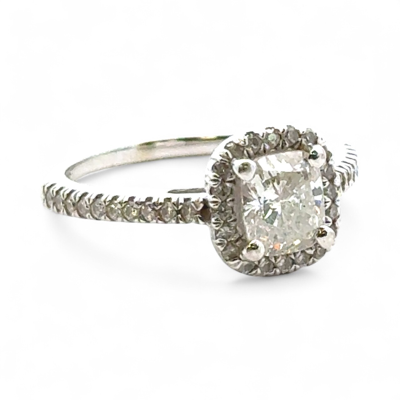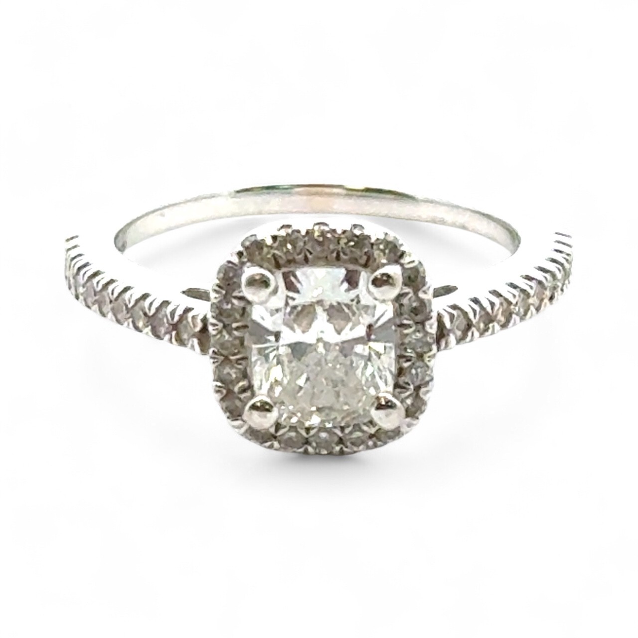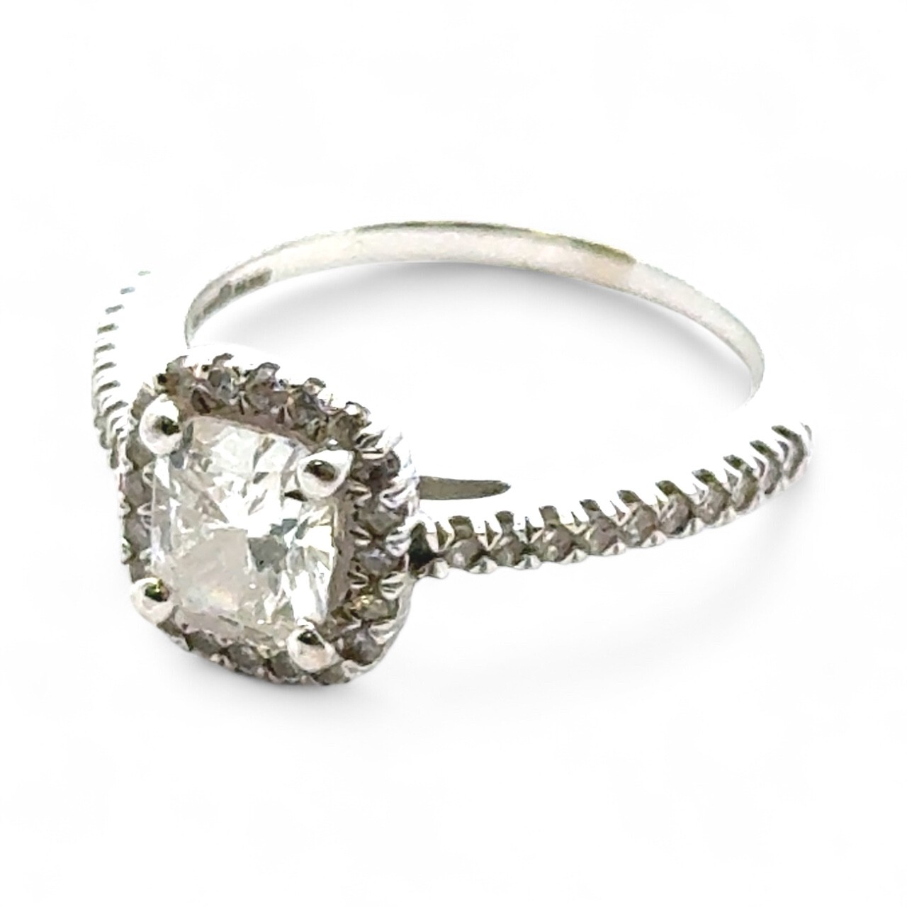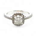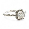 A 0.71ct cushion cut diamond halo ring with diamond set shou...