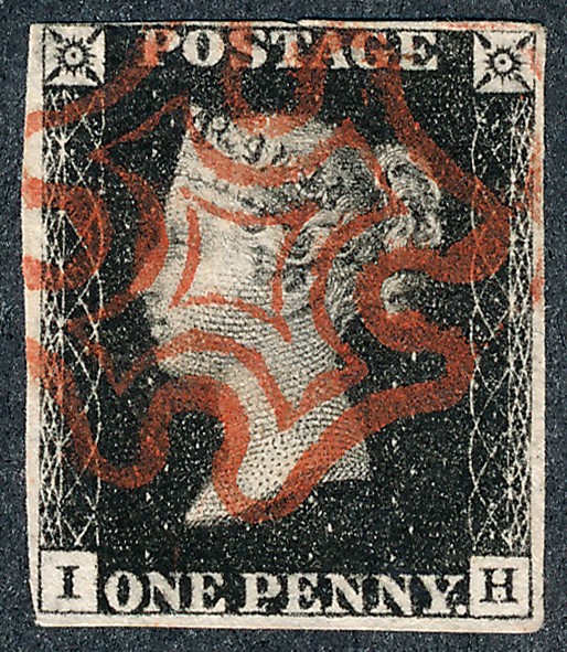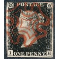 Great Britain 1840 1d black FU with red MC cancel and three clear margins, lettered IH.