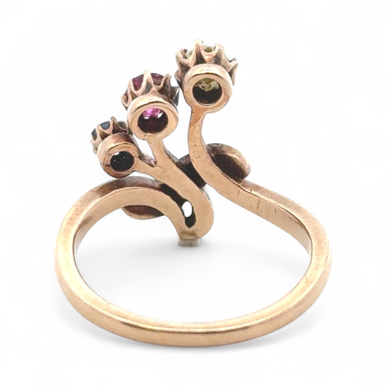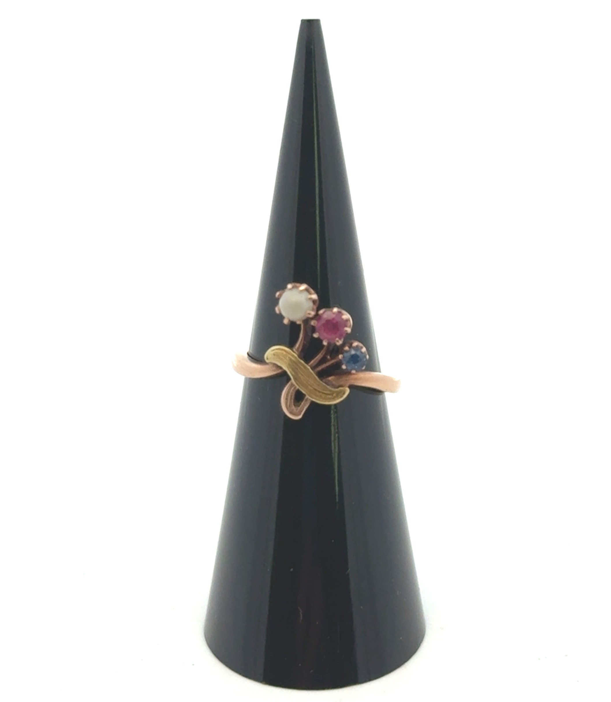 An unusual ruby, sapphire and white stone ring, stamped 585. size J.