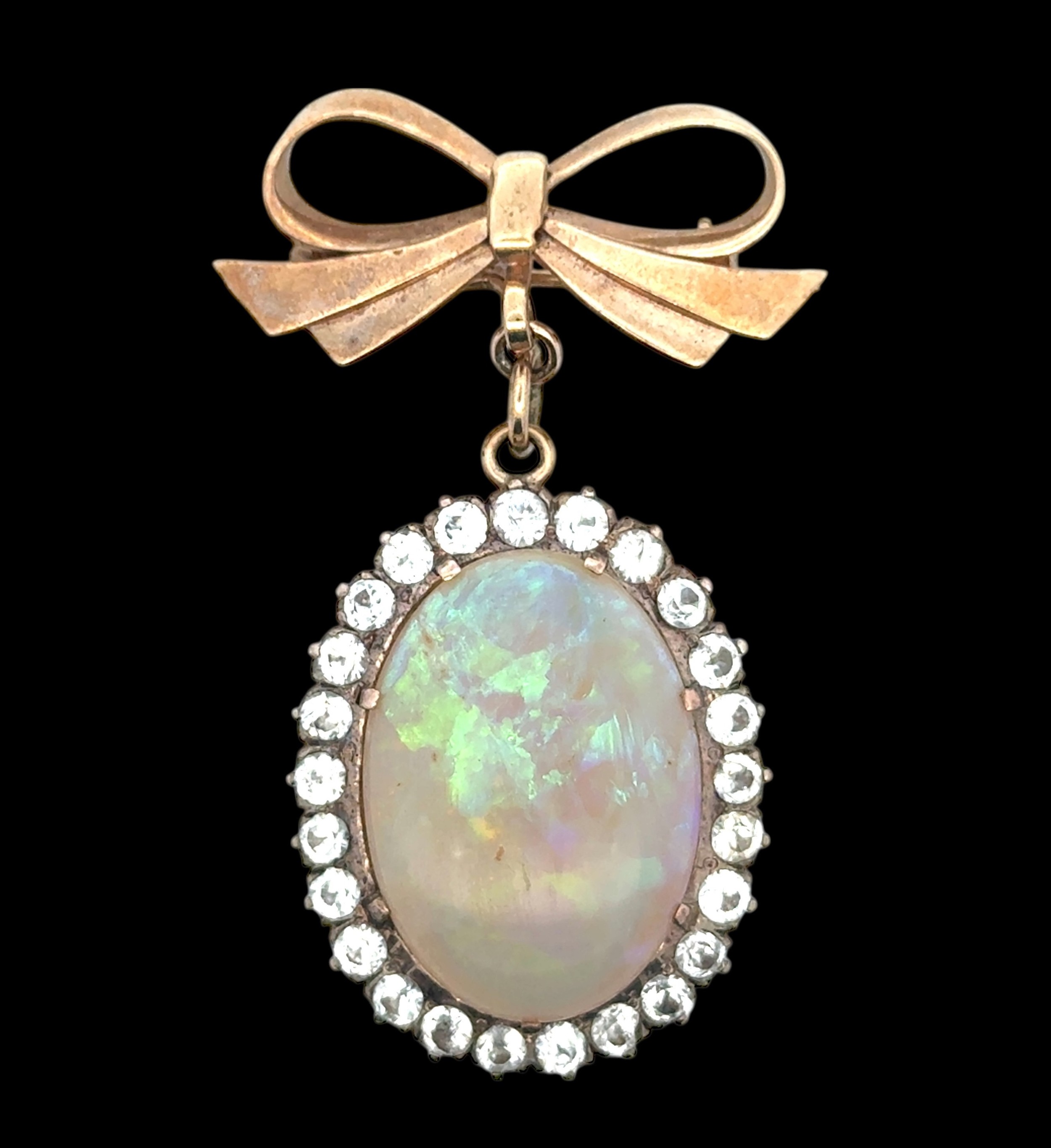 An opal and white stone bow brooch. Opal approx 25mm x 18mm. Bow with Birmingham hallmarks. Length 58mm. Condition: opal with what appears to be organic inclusions and some internal fractures. Several of the paste stones with cracks and chips.