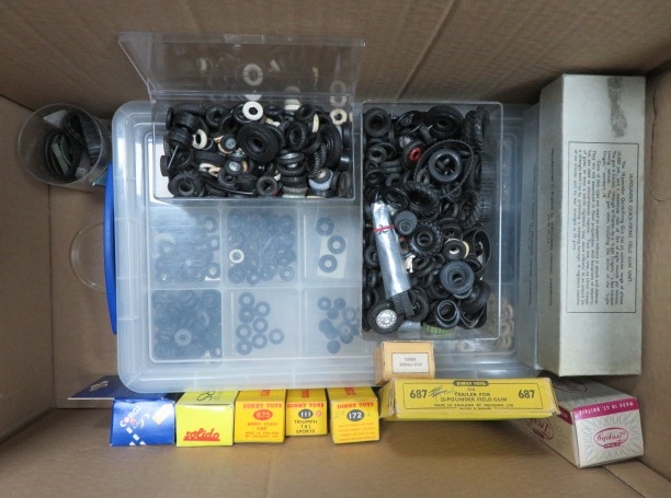 Diecast spares including tyres, parts, accessories, empty boxes, etc., range of Corgi, Dinky, etc., generally excellent to good fair. Contents unchecked for completeness or correctness. Viewing highly recommended. Qty approx. 100+