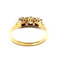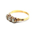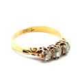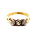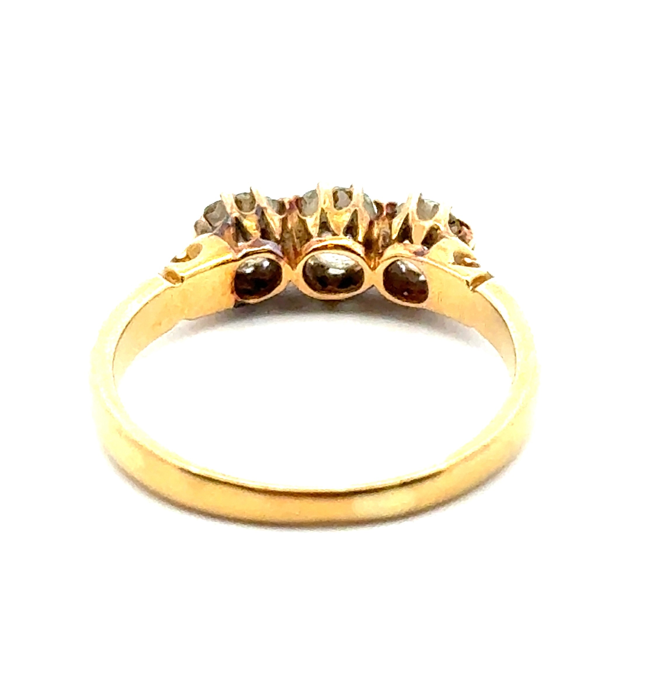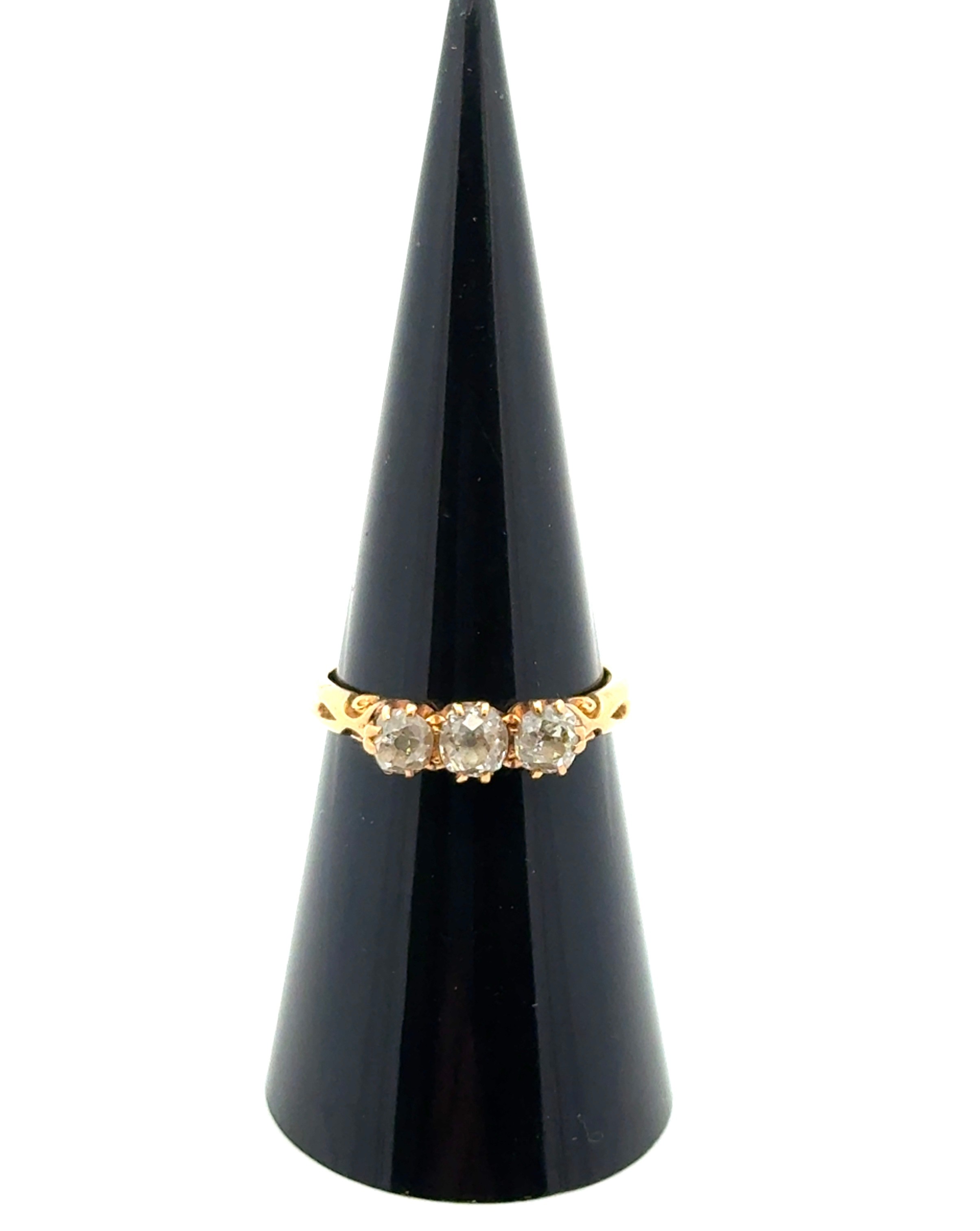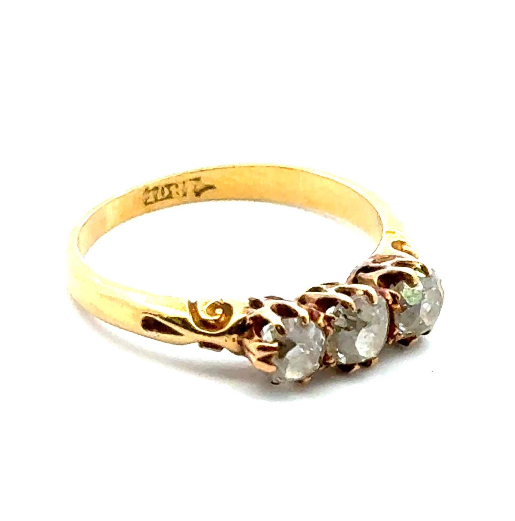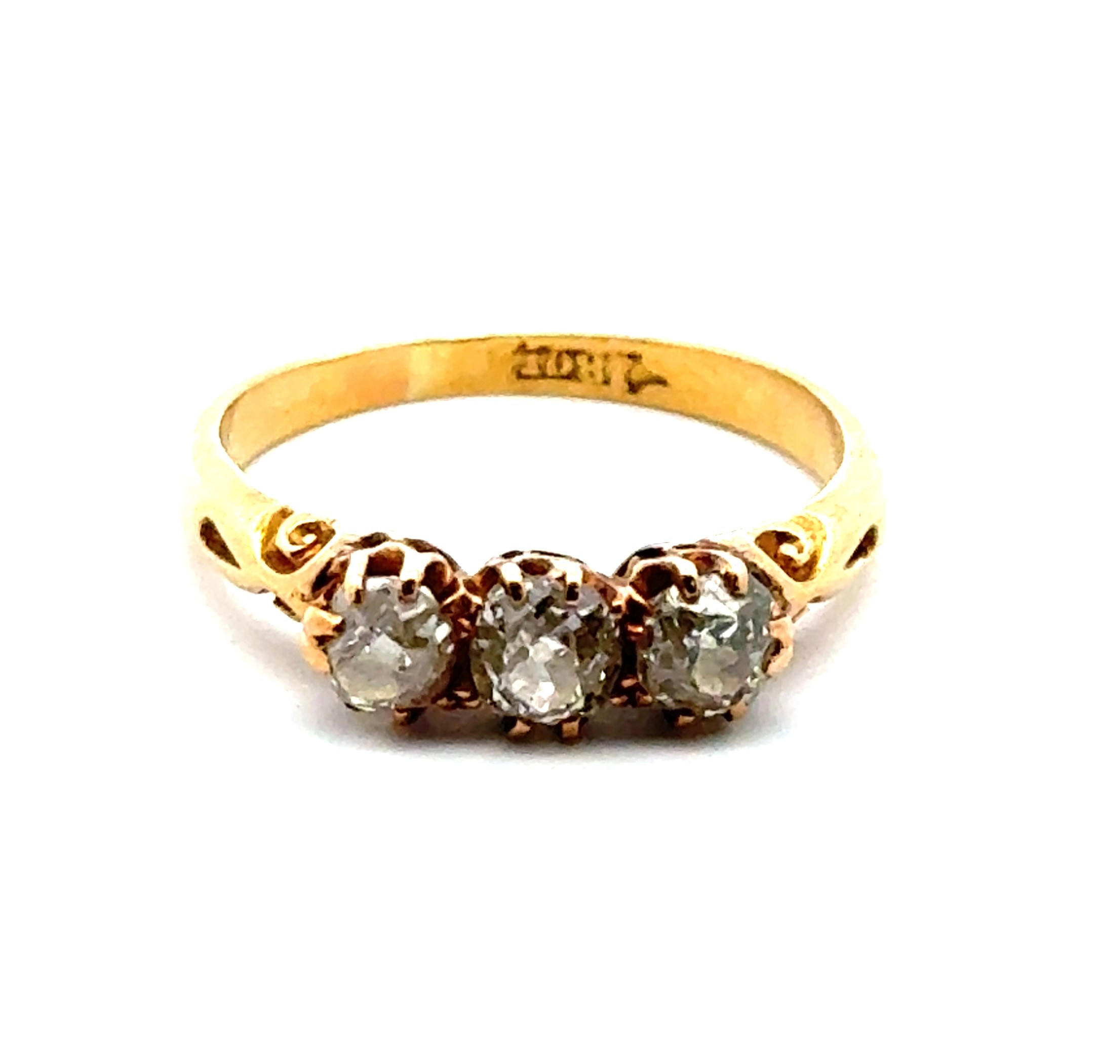 A three stone old cut diamond ring with scrolled shoulders, stamped 18ct. Total diamond weight 0.56g. Size L 1/2. 2.85g