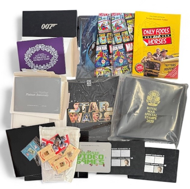 Great Britain, collection of recently issued Presentation packs and folders. Includes; 2020 Yearbook library edition (face £232), Star Wars, DC Collection, Marvel (x2), Video Games tin, Only Fools and Horses, Royalty souvenir packs (x6), David Bowie “records” (x5) fan sheets (face £44), QEII silver stamp packs (x2), Royal Mail pin badges (x16) including Wallace & Gromit, Thunderbirds etc, 007 James Bond silver mini sheet etc.