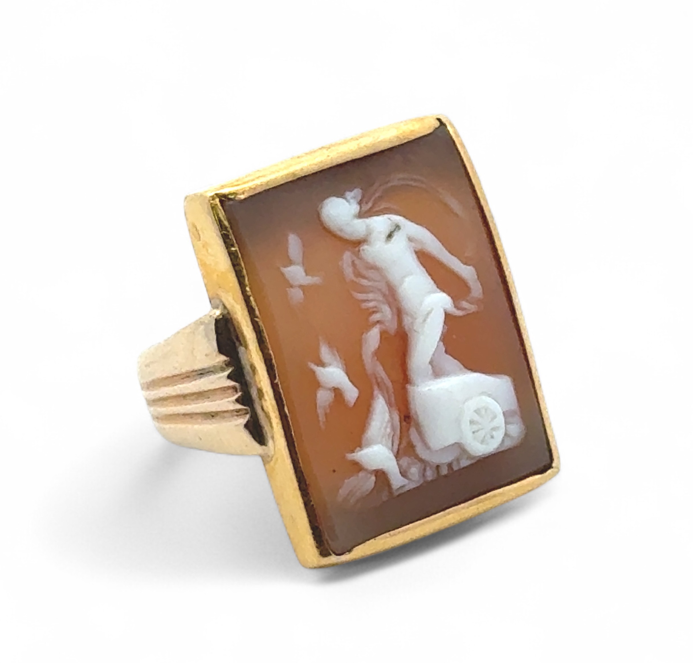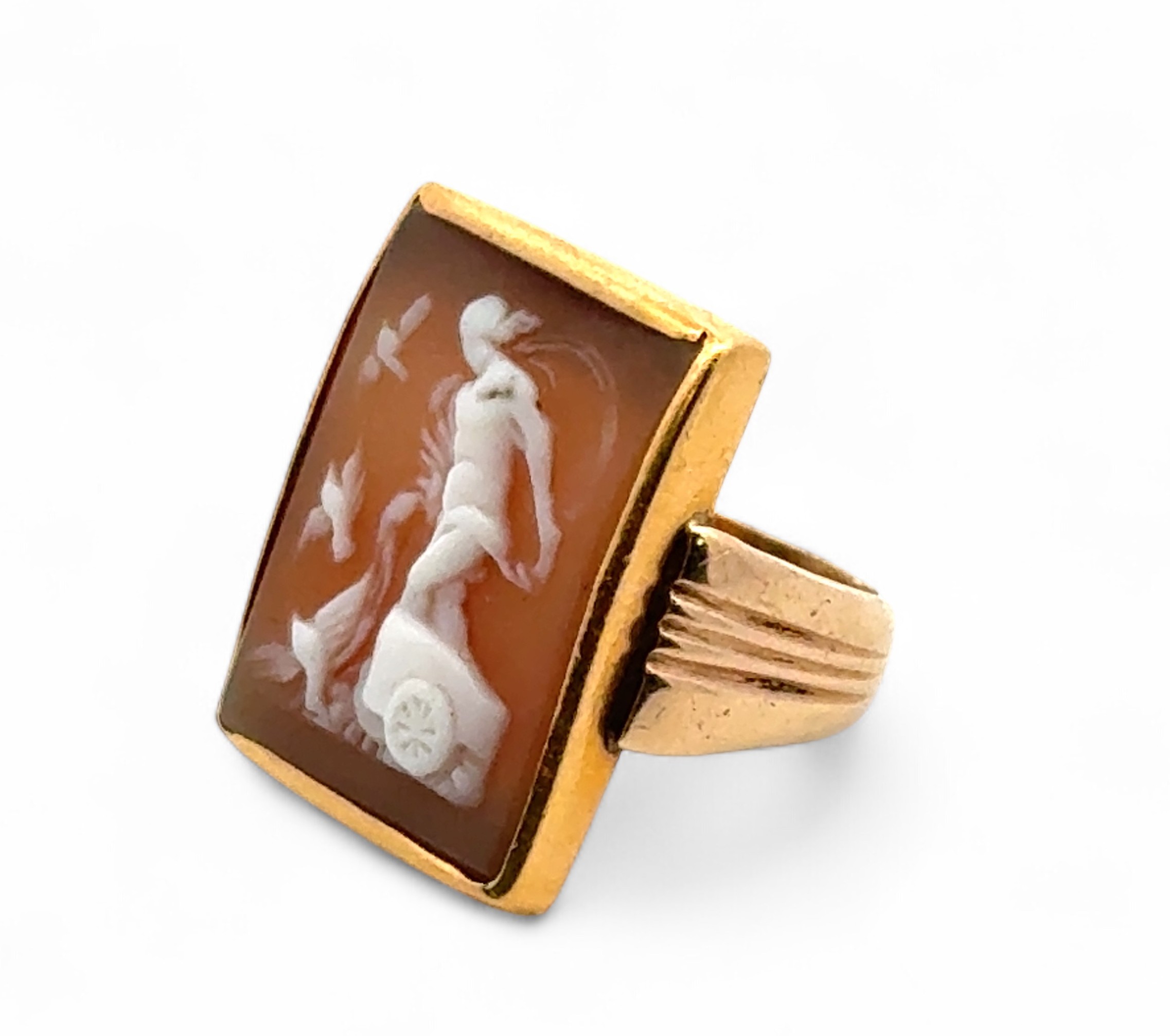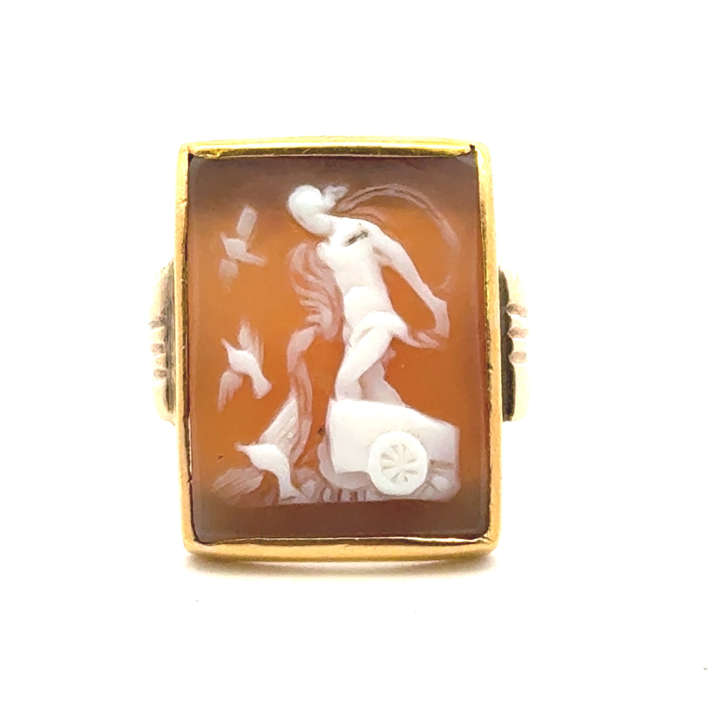 Cameo ring - an unmarked yellow metal set with a rectangular cameo depicting the goddess Aphrodite riding a chariot and surrounded by doves. Ring head 22mm x 17mm. Tested as approx 15ct gold using XRF. Size L 8.20g
