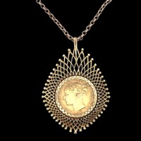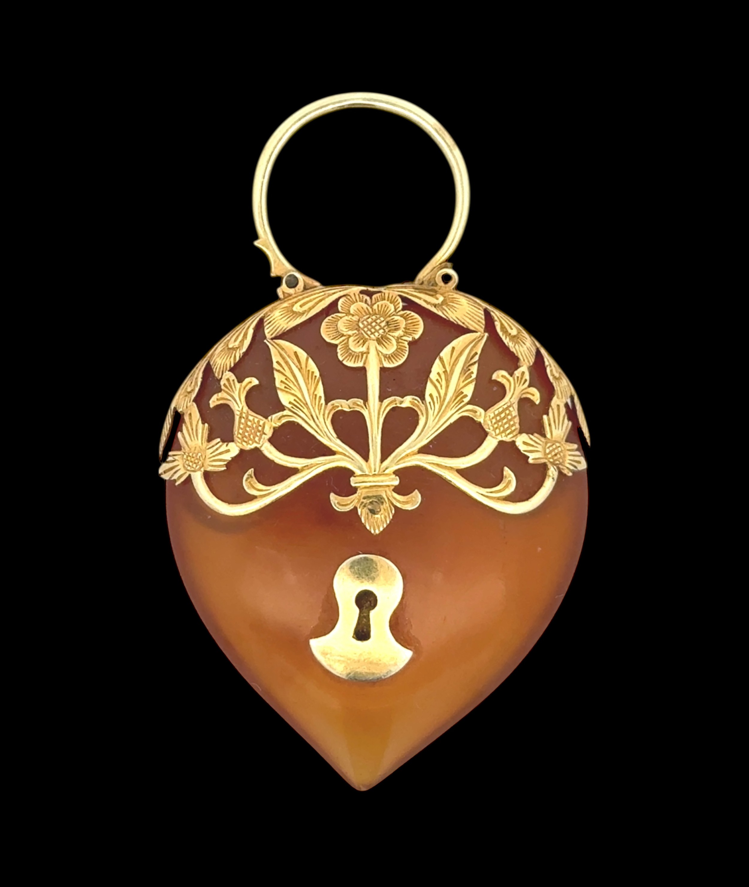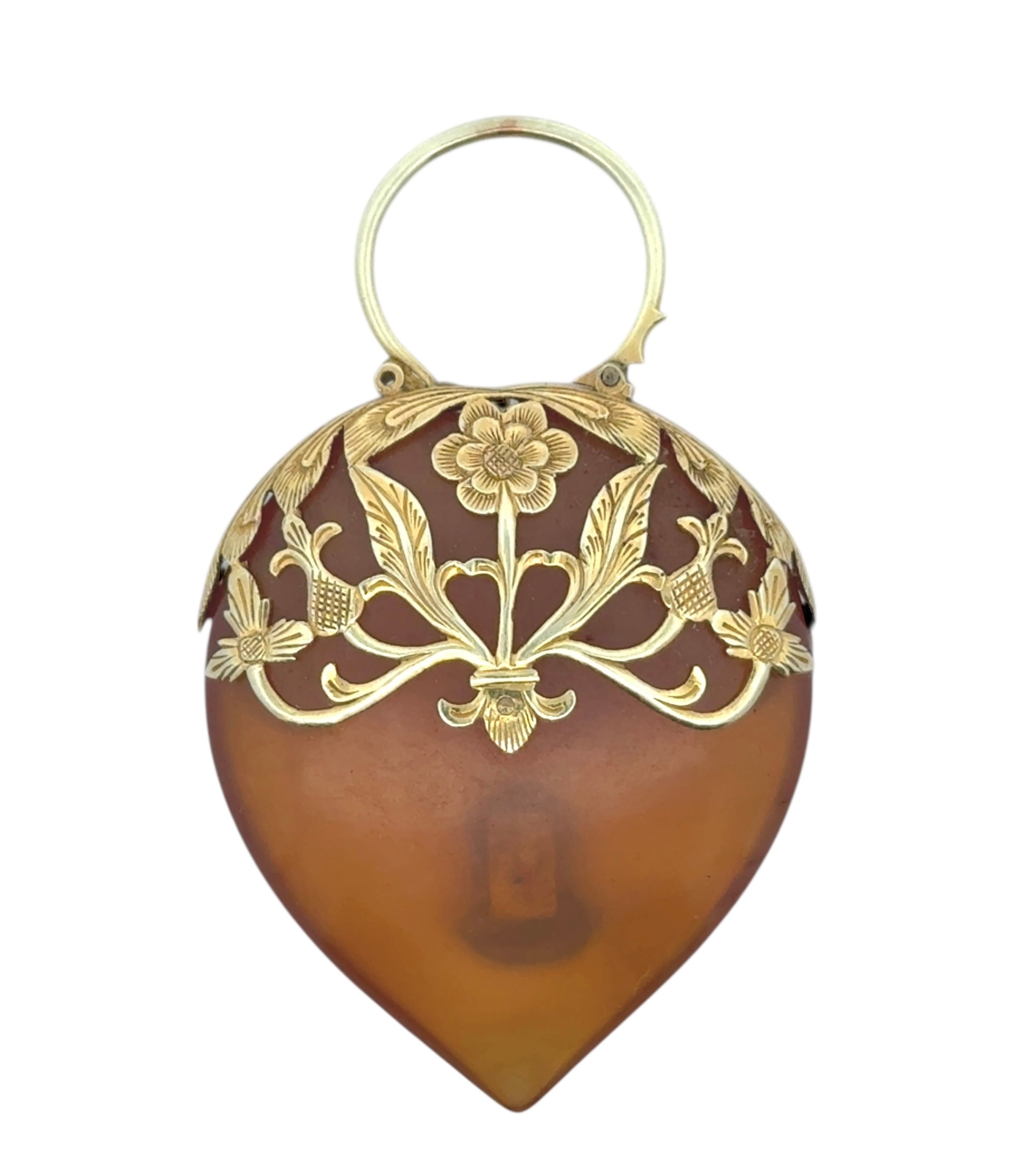 A pear-shaped tortoiseshell pendant with unmarked yellow met...