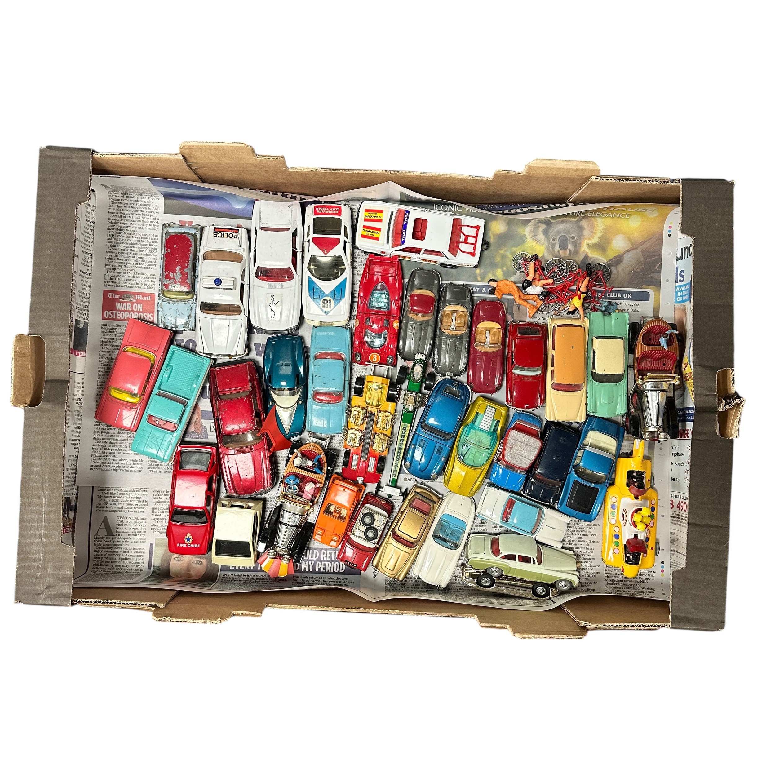 Corgi unboxed collection, with James Bond 007 Aston Martin DB5 Goldfinger No. 261, Chitty Chitty Bang Bang (2) No. 266, The Beatles Yellow Submarine No. 803, etc., generally good plus to good fair. Contents unchecked for completeness or correctness and viewing recommended. Qty 36